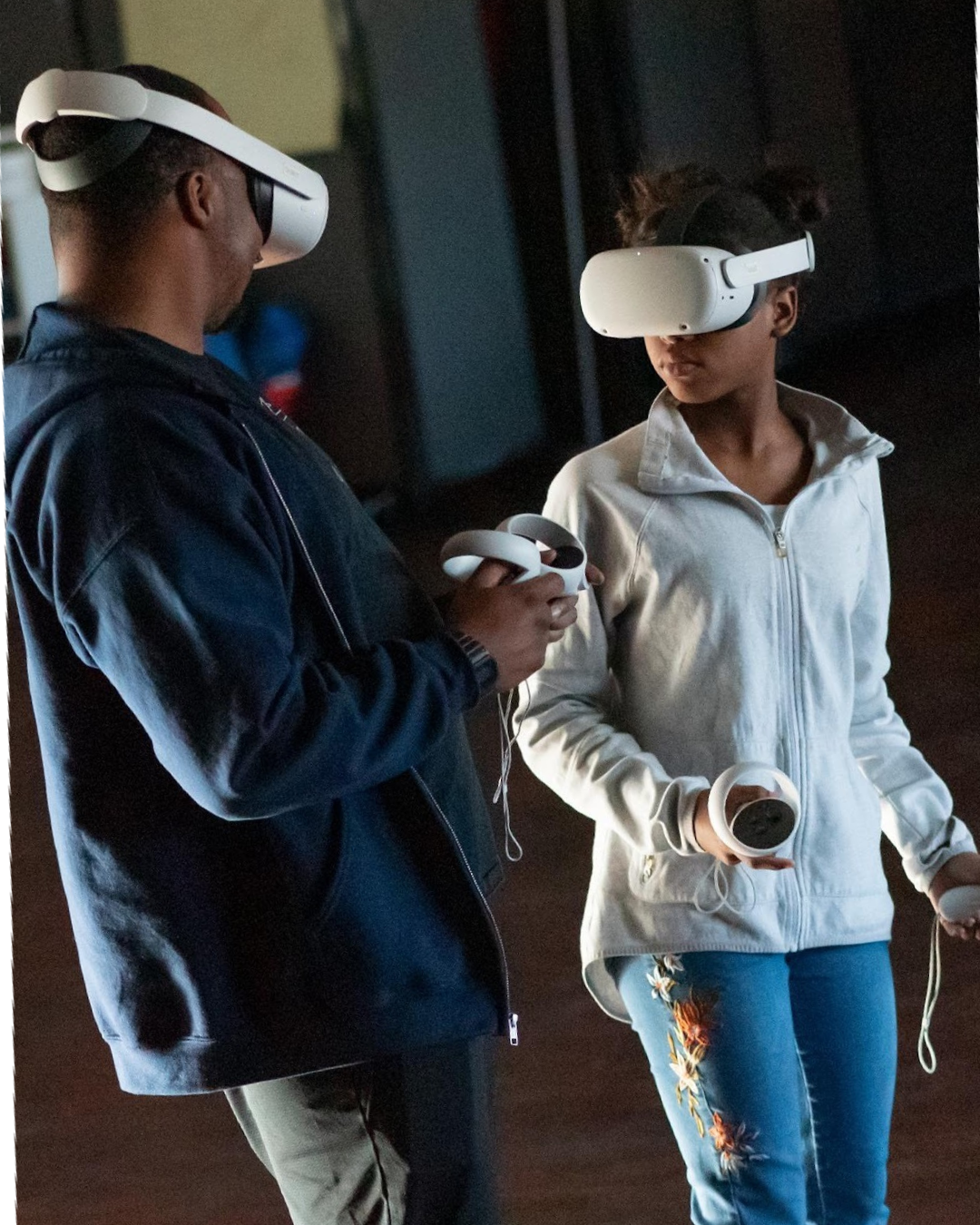 Students solve puzzles and color in 3D spaces using virtual reality.